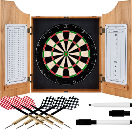 This TG™ Beveled Wood Dart Cabinet comes with everything you need to start playing. It includes a high quality, self healing dart board, 6 steel tip darts, dry-erase scoreboard, out chart, marker and mounting supplies.