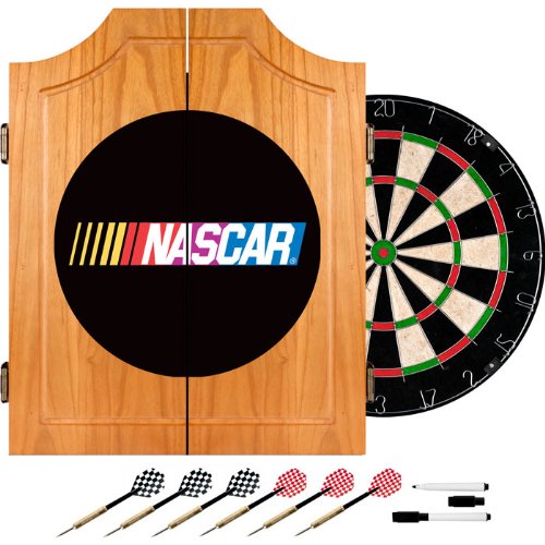 Bring the game to your game room, garage or collection with an officially licensed NASCAR beveled wood dart cabinet. Enjoy competition among friends while pre-gaming, during halftime, or at the after party . The officially licensed NASCAR beveled wood dart cabinet comes with everything you need for a great game. It includes a high quality, self healing sisal fiber dartboard, six steel tipped darts, dry-erase scoreboard, out chart, marker and mounting supplies. With an officially licensed NASCAR beveled wood dart cabinet you're guaranteed to have fun no matter what the score!