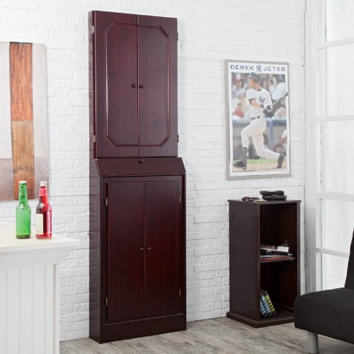 Full-size arcade- and pub-style dart board cabinet . Durable pine wood with rich mahogany finish . 2 double door sets and flip panel with magnetic closure . Fits standard bristle boards and most electronic boards . Single shelf in lower cabinet . Measures 25.78W x 7.08D x 86.61H inches .
