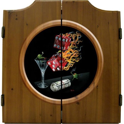 Includes two steel tip dart set, dry erase scoreboard and pen. Tournament bristle dartboard. Removable number ring. Made from pine. Oak finish. 18 in. Dia. sisel fiber dartboard. 21 in. W x 3 in. D x 23.5 in. H (22 lbs.)Read more Michael Godard Dartboard Cabinet Set - Shooting The Wad