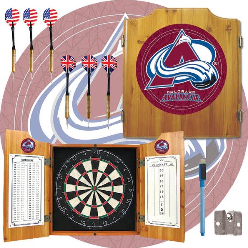 This National Hockey League Officially Licensed Dart Cabinet with quality dart board and darts included.? Features include: 22 x 25 inch solid wood cabinetmedium wood finishfull color logo displayed on front of?cabinetfull color logos also displayed above the scoreboards inside the?cabinet doorsbristle dartboard included2 sets of darts includedRead more NHL Colorado Avalanche Dart Cabinet includes Darts SKU-PAS407021