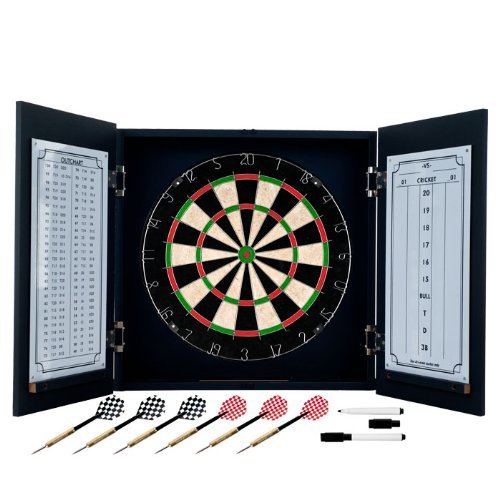 Bring the game to your game room, garage or collection with an officially licensed beveled wood dart cabinet. Enjoy competition among friends while pre-gaming, during halftime, or at the after party . The officially licensed beveled wood dart cabinet comes with everything you need for a great game. It includes a high quality, self healing sisal fiber dartboard, six steel tipped darts, dry-erase scoreboard, out chart, marker and mounting supplies. With an officially licensed beveled wood dart cabinet you're guaranteed to have fun no matter what the score!