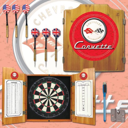 This Corvette C1 Dart Cabinet comes with everything you need to start playing. It includes a high quality, self healing dart board, 6 steel tip darts, dry-erase scoreboard, out chart, marker and mounting bracket to mount the board in the cabinet. Features include: Solid pine cabinet Full color logo displayed on front of cabinet and also displayed above the scoreboards inside the cabinet doors 18 Inch bristle dartboard with self healing sisal fiber 2 sets of steel-tipped darts Door mounted dry erase score board and out chart Dry-erase marker and mounting bracket to mount the board to the cabinet Cabinet measures 23. 25 x 21. 25 x 3 inches