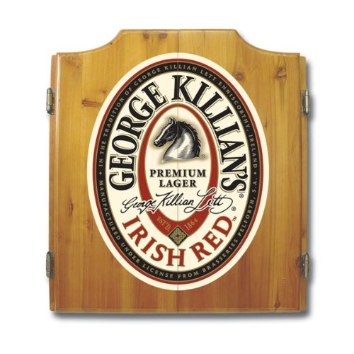 This George Killians Irish Red Officially Licensed Dart Cabinet with quality dart board and darts included.? Features include: 22 x 25 inch solid wood cabinetmedium wood finishfull color logo displayed on front of?cabinetfull color logos also displayed above the scoreboards inside the?cabinet doorsbristle dartboard included2 sets of darts included