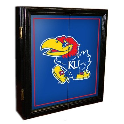 7515-KAN NCAA Team: Kansas Features: -Comes with 2 scoreboards and mounting bracket for bristle board hanging.-Darts / chalk / wall-mounting hardware not included.-Keeping your cabinet looking new each and every season.-Fits most standard bristle and electronic dartboards. Includes: -Bristle board and board mounting hardware included. Construction: -Solid wood construction. Color/Finish: -Sleek, black finish with Brass hinges.-Full-color, digitally-printed graphics. Specifications: -Cabinet (13lbs, 18lbs with bristle board). Dimensions: -Overall dimensions: 26'' H x 23'' W x 4'' D.