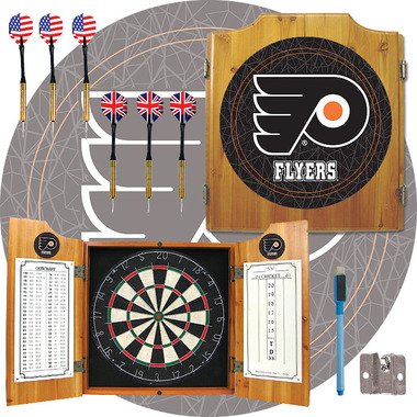 NHL Philadelphia Flyers Dart Cabinet includes Darts and Board p>This National Hockey League Officially Licensed Dart Cabinet with quality dart board and darts included. Features include: 22 x 25 inch solid wood cabinet medium wood finish full color logo displayed on front of cabinet full color logos also displayed above the scoreboards inside the cabinet doors bristle dartboard included 2 sets of darts included