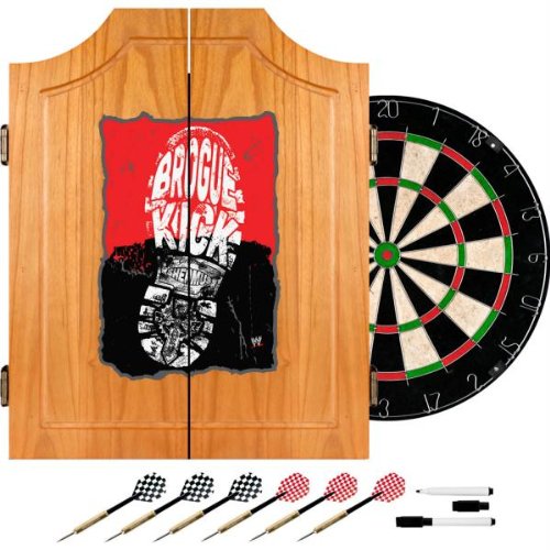 Officially Licensed WWE Product. Bring the game to your game room, garage or collection with an officially licensed beveled wood dart cabinet. Enjoy competition among friends while pre-gaming, during halftime, or at the after party. The officially licensed beveled wood dart cabinet comes with everything you need for a great game. It includes a high quality, self healing sisal fiber dartboard, six steel tipped darts, dry-erase scoreboard, out chart, markers and mounting supplies. With an officially licensed beveled wood dart cabinet you're guaranteed to have fun no matter what the score.