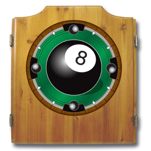 This 8-Ball dart cabinet features a?quality dart board and darts included.? Features include: 22 x 25 inch solid wood cabinet medium wood finish full color logo displayed on front of?cabinet full color logos also displayed above the scoreboards inside the?cabinet doors bristle dartboard included 2 sets of darts included