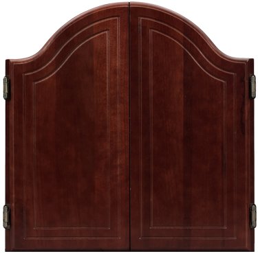 This arched mahogany dart cabinet will house your dart board and dartswhile allowing you to close the cabinet while not in use. Protect your wallsfrom the steel tip darts while beautifying your game room. Dartboard features: Dimensions: 23h x 22w x 3 1/2d Decorative arched top Tongue and groove joint construction Brass hinges Accepts round steel-tip or soft-tip dartboards (not included) Holds two (2) sets of darts (not included) Scoreboard on inside of each door