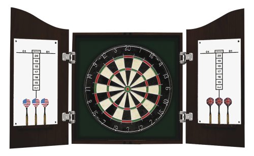 Everything you need to play a high stakes game of darts is packed into this beautiful Harvil Deluxe Solid Wood Dartboard Cabinet Set. This high-quality cabinet is made of North American poplar hardwood, and stained with a beautiful espresso finish. The cabinet features two pub style chalk scoreboards for playing cricket and 01, two sets of darts with British and American flights, and a regulation dartboard with a removable number ring. This handsomely finished cabinet stores and protects your dartboard while protecting your back wall from stray darts during games and adds a touch of elegance to your game room.