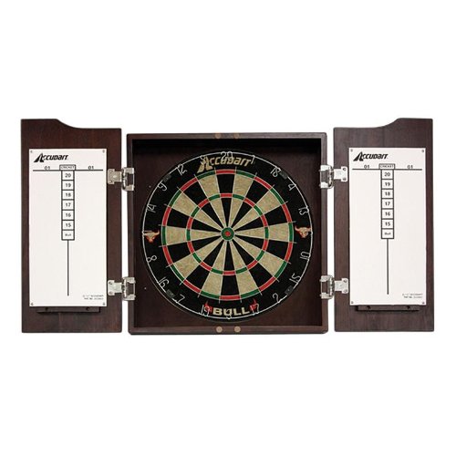 Attractive and durable, the Accudart Bull dartboard cabinet set is an excellent choice for your game room. This cabinet features a solid wood design and high-profiled doors. Keep everything within reach with the built-in dart storage and double dry erase scoreboards and marker. Includes the Bull Bristle Dartboard, (6) Quality Brass Darts, and "Play Darts...Easy as 1, 2, 3" brochure.Read more Accudart Bull Dartboard Cabinet and Set