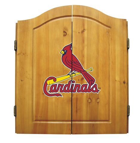 Saint Louis Cardinals St.dartboard cabinet set. This Cardinals dart cabinet and dart board set comes with everything you need. With the solid pine cabinet, real bristle dart board and 6 steel tip darts this is not your average dartboard. Set consists of: solid pine dart cabinet, bristle dart board, 3 black and 3 silver darts with team name on barrel, League Logo flights, chalk and eraser. All mounting hardware included. Large team logo on outer door and 2 smaller logos on inner door above the chalk boards.