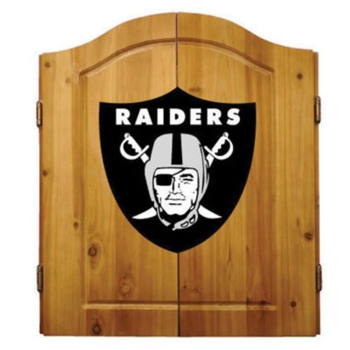 Football Dartboards. Show your team spirit with one of our officially licensed football dartboards! With authentic logos for your favorite NFL team, it's an awesome addition to your den, games room, bar or garage. Solid pine dartboard cabinet opens up to reveal a traditional bristle dartboard and two chalkboards for keeping track of scores. The outer doors of the cabinet and the chalkboards inside all feature the genuine team logo for the NFL team of your choice. Includes six NFL darts, chalk and an eraser. 25" w x 5" d x 27" h (when cabinet doors are closed). Please allow two weeks for delivery. It's a games room classic, with officially licensed team logos--order your NFL dartboard today! NFL is a registered trademark of the National Football League.