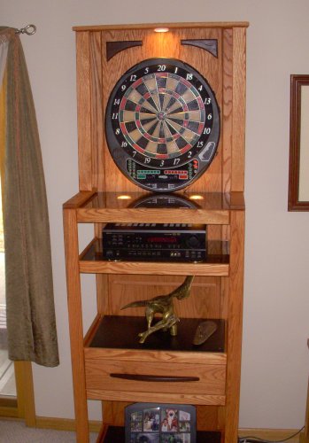 Product Description : Dartboard Cabinet with Ebony Finish Accents, Safety Glass Shelves, and Lighting Above and Below Dartboard