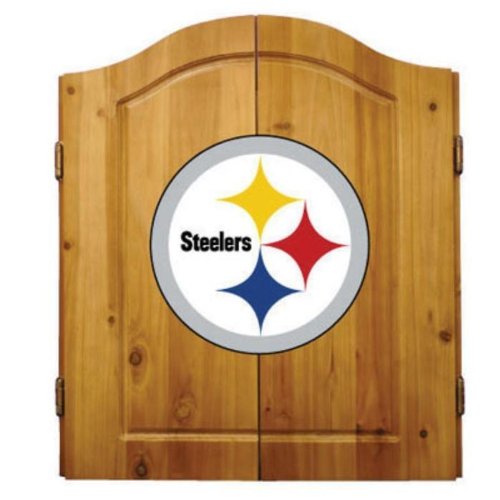 Football Dartboards. Show your team spirit with one of our officially licensed football dartboards! With authentic logos for your favorite NFL team, it's an awesome addition to your den, games room, bar or garage. Solid pine dartboard cabinet opens up to reveal a traditional bristle dartboard and two chalkboards for keeping track of scores. The outer doors of the cabinet and the chalkboards inside all feature the genuine team logo for the NFL team of your choice. Includes six NFL darts, chalk and an eraser. 25" w x 5" d x 27" h (when cabinet doors are closed). Please allow two weeks for delivery. It's a games room classic, with officially licensed team logos--order your NFL dartboard today! NFL is a registered trademark of the National Football League.