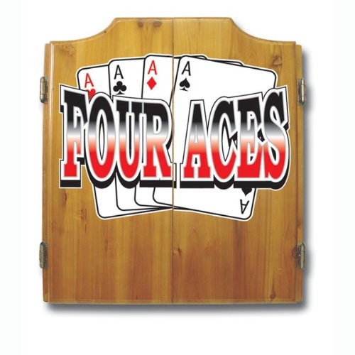 This Four Aces Dart Cabinet with quality dart board and darts included.? Features include: 22 x 25 inch solid wood cabinetmedium wood finishfull color logo displayed on front of?cabinetfull color logos also displayed above the scoreboards inside the?cabinet doorsbristle dartboard included2 sets of darts included