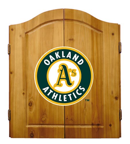 Product Description : MLB Oakland Athletics Solid Pine Cabinet And Bristle Dartboard Set