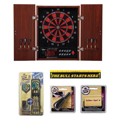 The sophisticated Viper Neptune Electronic Dartboard with Blazer Soft Tip Darts and Accessory Set includes everything you need for an exciting and accurate game of darts at home. The high-tech Neptune electronic dartboard is made of target-tested tough commercial grade nylon segments that outlast plastic. Among its many outstanding features, the Neptune comes standard with a four player 6in jumbo LCD display, 307 options, 57 games, and accommodates up to 16 players. This exclusive set also includes two steel tip Blazer darts, throw line, tip remover and extra tips! Ideal for any home game room, The Viper Neptune and Blazer Darts Set offers high quality at an incredible value.