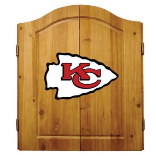 Football Dartboards. Show your team spirit with one of our officially licensed football dartboards! With authentic logos for your favorite NFL team, it's an awesome addition to your den, games room, bar or garage. Solid pine dartboard cabinet opens up to reveal a traditional bristle dartboard and two chalkboards for keeping track of scores. The outer doors of the cabinet and the chalkboards inside all feature the genuine team logo for the NFL team of your choice. Includes six NFL darts, chalk and an eraser. 25" w x 5" d x 27" h (when cabinet doors are closed). Please allow two weeks for delivery. It's a games room classic, with officially licensed team logos--order your NFL dartboard today! NFL is a registered trademark of the National Football League.
