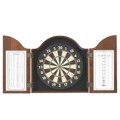 Viper 40 - 0256 Features: -Oak dartboard cabinet with mahogany finish & decorative arched top. -Black felt backing inside cabinet. -Box Joint construction and brushed nickel hinges. -Includes dry erase scoreboard, outchart, marker, and mounting hardware. -Fits most traditional sisal fibre steel-tip dartboards. -Mounting hardware included. -Dartboard & darts not included. -Open dimensions: 22-1/8"H x 43-3/4"W x 3-3/4"D. -Inside dimensions: 21"H x 21"W x 2-5/8"D.